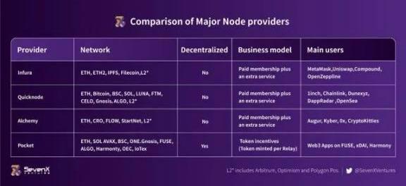 目前知名的服務商有Infura、Quicknode、Alchemy、Pocket。在選擇服務商時,開發者和創業者主要會考慮覆蓋鏈的數量、商業模式、附加服務的多樣性。他們還會考慮服務是否去中心化。