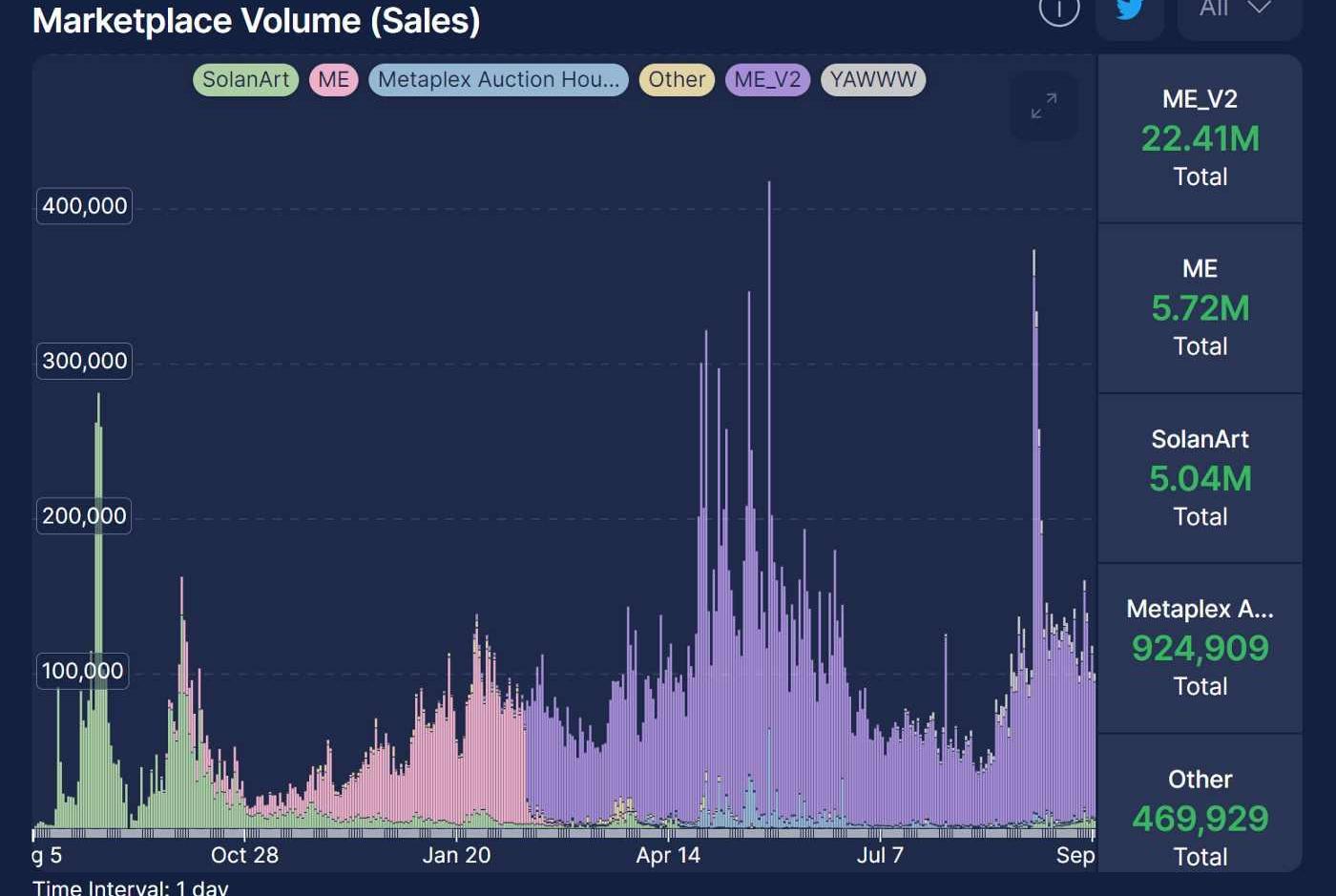 MagicEden目前占據著SolanaNFT交易量的70%-80%,而第二大最受歡迎的市場在過去的一個月里僅占15%,但一時優勢并不是持續性的。在MagicEden出現之前,Solanart擁有Solana的NFT份額,在2021年第三季度,大規模推出DegenerateApeAcademy后,8分鐘內售出1萬只ape,迅速躋身主流。