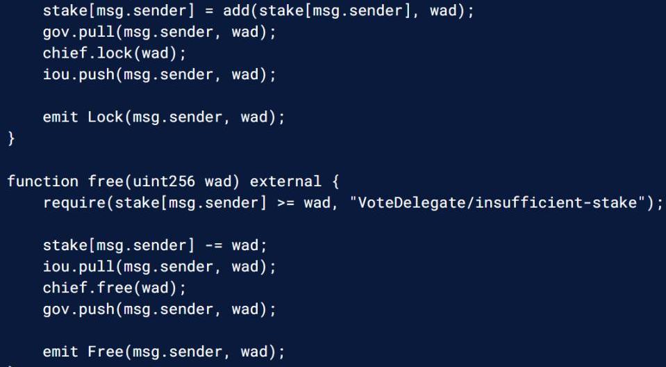我們使用Maker合約進行演示。大多數核心委托邏輯都存在于VoteDelegate.sol合約中,特別是注意lock和free函數,它們完全能夠滿足要求。代幣持有者使用lock函數來捆綁代幣并分配其治理權,并使用free函數收回這些代幣和相關的治理權。