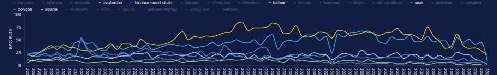 從代碼提交的絕對數量和活躍開發者數兩個指標上都能看出Near,SOL,Avax名列前茅,說明他們在公鏈的更新迭代上做了更多的工作。在經歷了去年開發的活躍期后,各公鏈本身開發的活躍度都有所回落,這一現象在SOL和Avax上尤其明顯,不過Near卻呈現出了完全不一樣的走勢——維持了去年的活躍水平并有上升趨勢,進一步說底層還有很多優化工作,團隊也在積極搭建。