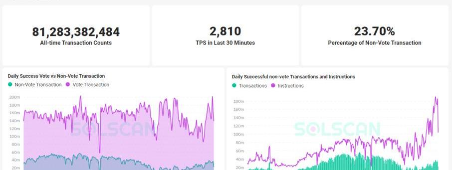 排除由于IDO,NFTmint等特殊事件的影響,常態下SOL的TPS高位能穩在3000左右,但我們通過瀏覽器可以看到,在3000TPS里面平均有差不多76%都是為達成鏈上共識的消息,這不能被算做真實用戶交易,應排除。剩余TPS里,觀察到與serum交互的簡單交易占據不小的比例,因此,我們認為這同樣不能算作真實用戶耗量,應排除。剩余的真實用戶交易在10%左右,因此真實TPS為300左右。不過此方法并沒有測算到SOL的極限值,因此實際的TPS應該是300+。至于SOL鏈經常宕機導致用戶體驗差,那是另一回事,不在本次討論范圍。