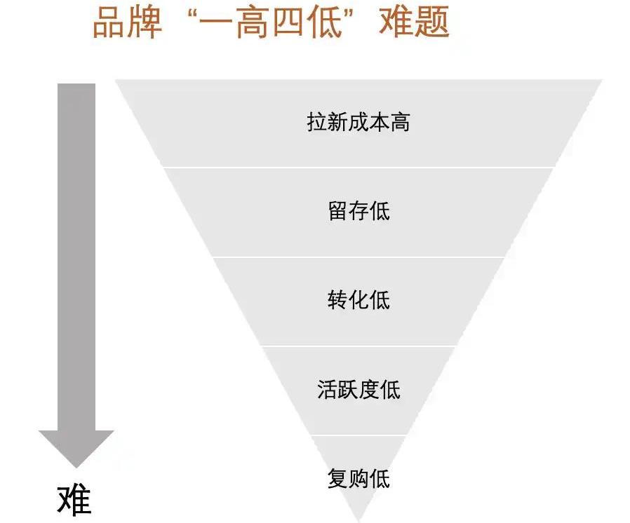 通過打造品牌,增強用戶心智進而擴大客戶規模及促進客戶持續復購,這個路徑在以寶潔、聯合利華為代表的傳統快消品時代得到了很好的驗證,也成為后來眾多品牌發展習以為常的有效經驗。但從過去10年至現在,這一經驗逐漸不再是普遍適用的法寶,從拉新到留存到轉化到促活到復購,品牌效力式微,日益面臨「一高四低」的突出難題:拉新成本高、用戶留存低/忠誠度低、轉化低、活躍度低、復購低。