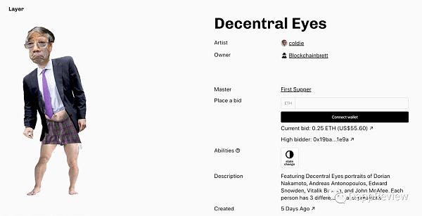 其中多里安·中本形象的Decentral Eyes以77 ETH的交易價成為最貴的Layer。