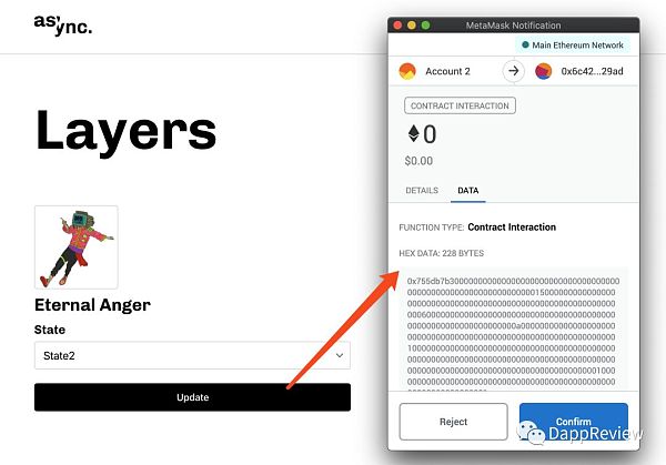 這一步是由Layer的擁有者發起一筆交易,調用智能合約中的函數useControlToken來修改記錄在AsyncArt主合約中該Layer NFT的參數。上圖是Vincent在AsyncArt頁面更新其拍下的Layer狀態至State2.