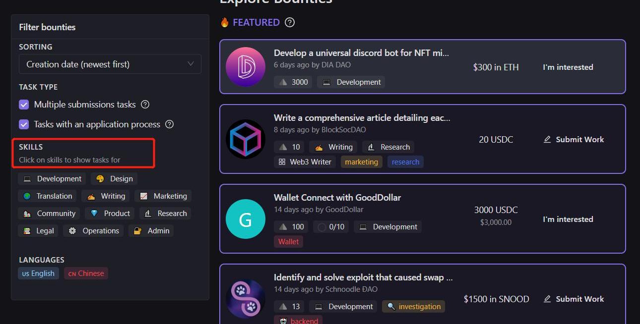 用戶可以通過Discord登錄,然后綁定錢包,通過點擊「OpenBounties」來查找正在進行的懸賞活動,此外用戶還可以根據自己的技能,篩選適合自己的任務,如writing、Research、Translation,同樣Dework平臺也會根據用戶提供的優勢技能推薦任務。