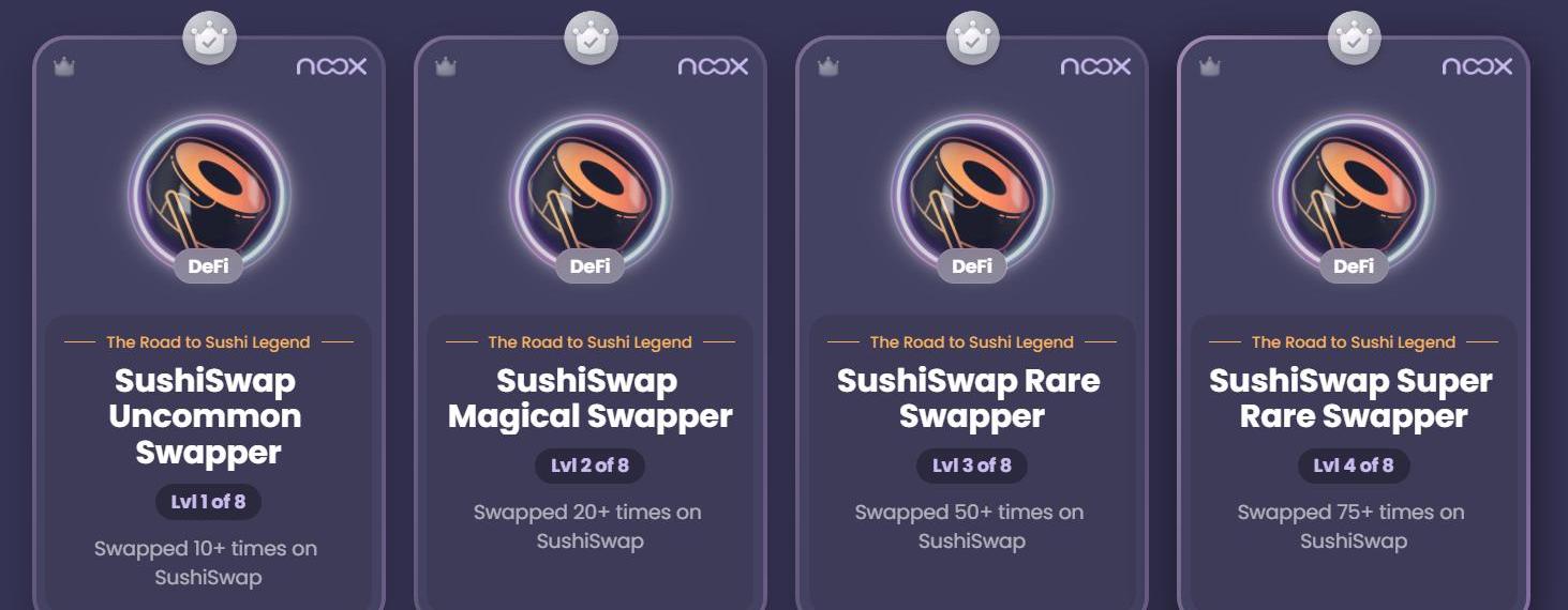 Noox是以太坊生態旨在構建一個去中心化的成就證明平臺,用戶在滿足相應條件后,即可鑄造對應的NFT,稱為「徽章」。Noox徽章記錄著用戶的鏈上行為,用戶能夠可視化他們所做的事情,如通過SushiSwap的徽章,用戶可以了解自己在SushiSwap上的交易次數范圍。