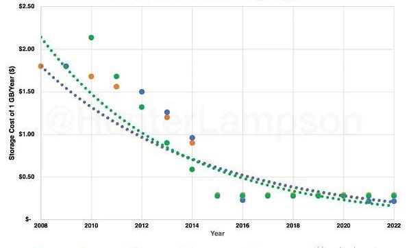 這是由三巨頭在過去十年中存儲成本的年均下降得出的,如下圖所示: