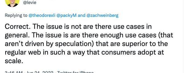 最終,這將不會通過辯論來解決。它將通過使用和有用性來解決,通過我在這里寫的東西,以及一大堆我無法想象的其他東西,是否能實現,或者如果詐騙、追加保證金、欺詐行為壓倒了積極的潛力。通過這場辯論,我意識到為什么即使我寧愿把注意力集中在積極的事情上,也要指出壞的行為者和不可持續的模式的重要性:通過證明懷疑論者是正確的并通過專橫的監管,壞的東西可以阻止好東西的出現。