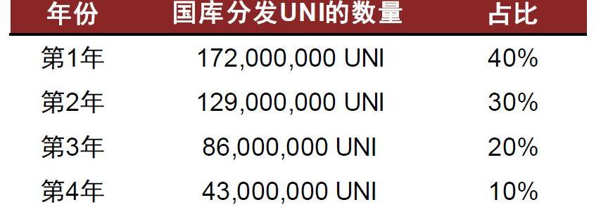 圖表:剩下的43%的UNI在四年間由社區金庫分發