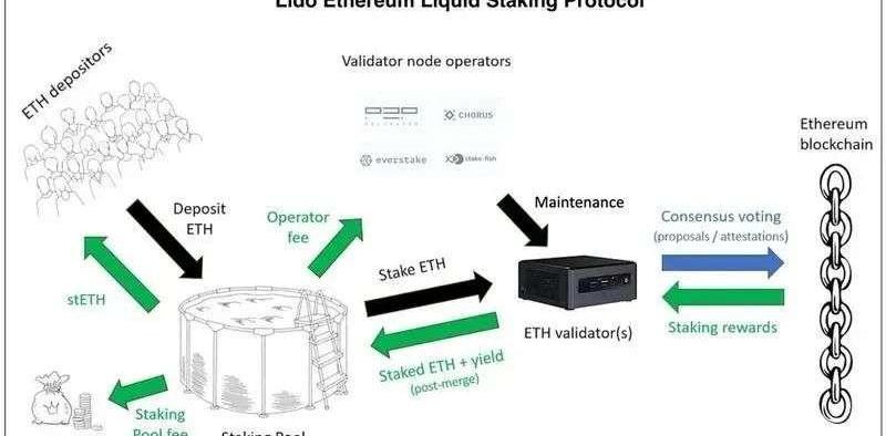 質押池合約通過驗證節點運營商的地址和秘鑰將池中資產分配給節點運營商進行實際的鏈上質押,并負責把質押獎勵鑄造成st資產,按比例分配給節點運營商、LidoDao國庫和質押者。