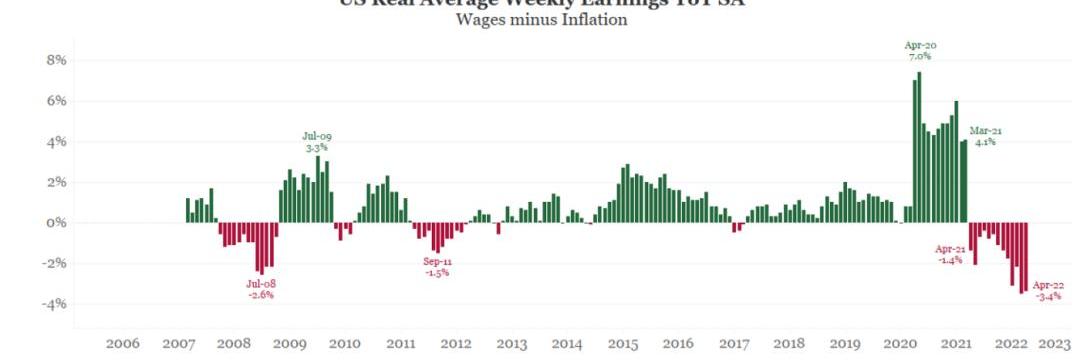 牛市開啟的先決條件是美聯儲和央行暫停加息并保持其資產負債表的規模不變。在當前加息周期下,CPI有所回調,但美國普通工人的收入也在減少。鑒于今年是美國的中期選舉年,隨著11月的到來,這將成為一個越來越大的問題,執政的民主黨將需要做些什么來糾正。