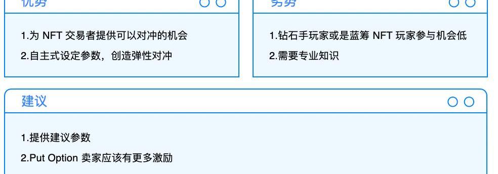 然而,這種模式會導致大部分鉆石手的NFT用戶不敢使用,縱然對沖掉了價格波動,但卻造成NFT的流失。在一般金融商品中便于在未來時間點內進行回補,但NFT的特殊性反而會造成應該行權但卻因為顧慮NFT流失的問題而不行權的狀態,反而有違項目設計本意。因此,使用情境上應該多為炒作的NFT,才有機會在這個市場中流通。