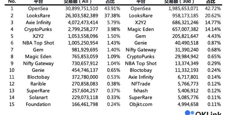 Top15NFT交易平臺占比,源自:OKLink數據