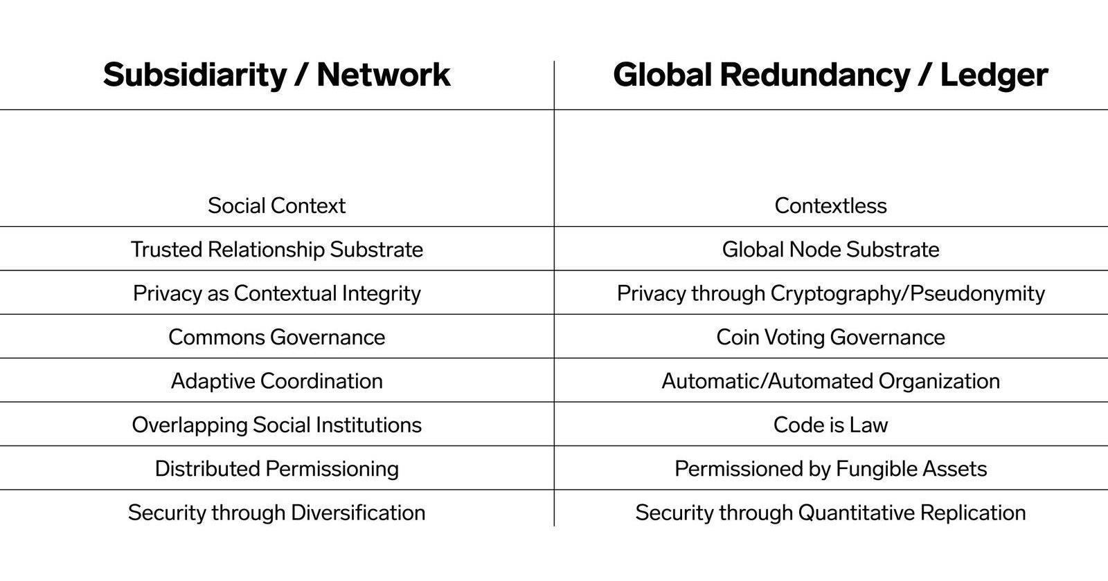 以下內容顯示了建立在對Web3有潛在影響的一些領域,普遍性和冗余性之間的區別。