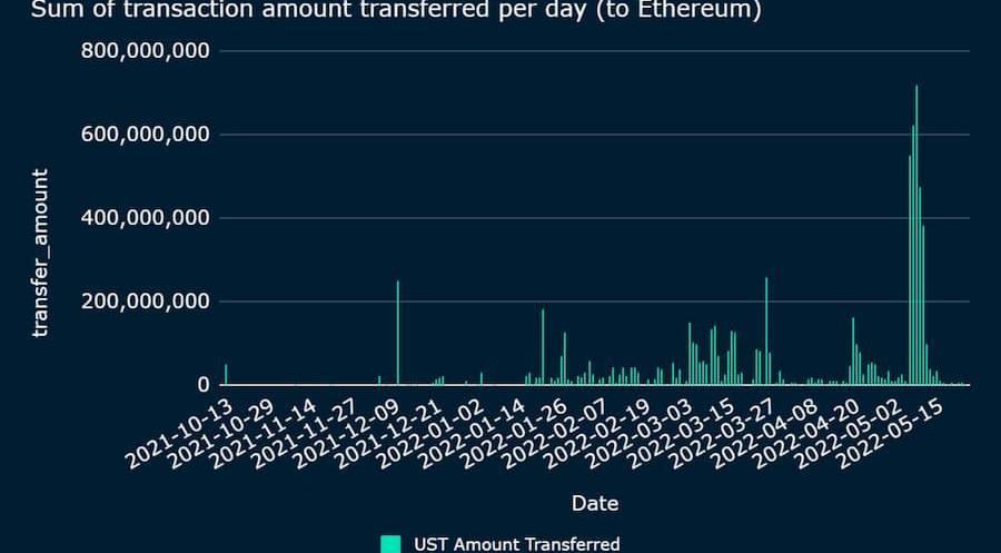 通過比較上圖顯示的UST的價格和交易量,我們發現5月8日的交易量明顯增加,與該代幣最初的價值損失同步。同樣,從Terra到Ethereum的歷史轉賬也在相同的日期前后顯示出明顯的活動。下面看到的峰值表明,大量的UST在脫錨期間通過跨鏈橋離場。