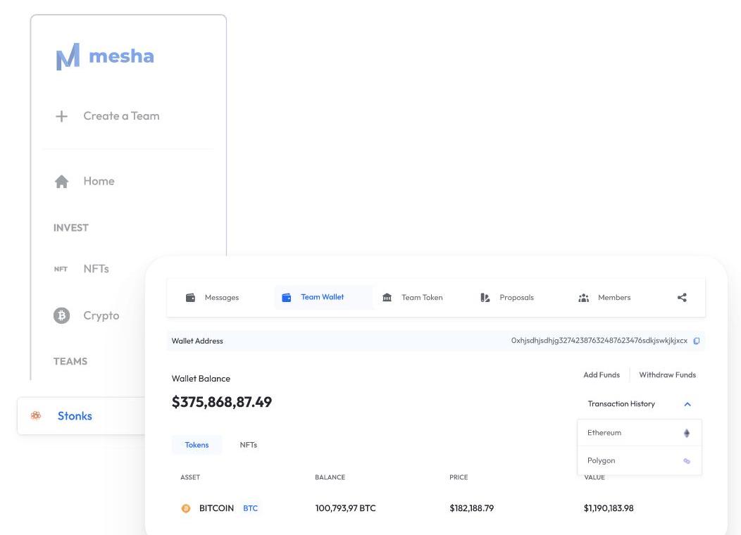 Mesha允許用戶創建群組并添加好友,在錢包中注入資金后,在群組內討論購買哪些代幣和NFT,投票后自動進行購買。目前Mesha已經實現了在OpenSea快速下單購買NFT,購買加密貨幣的渠道仍在建設中。