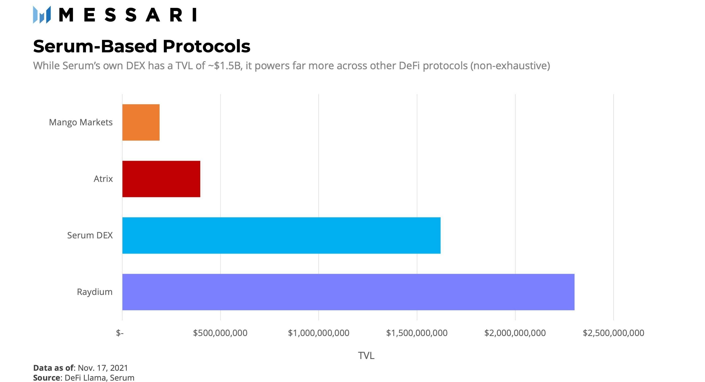 最令人印象深刻的是它如何成為許多生態系統最成功項目的首選DEX中間件。Raydium是一種訂單簿AMM,其TVL超過20億美元,總交易量超過280億美元,由Serum提供支持。Atrix是另一個在TVL中擁有近5億美元的“SerumAMM”,也直接與協議組成。還有太多其他的無法命名。
