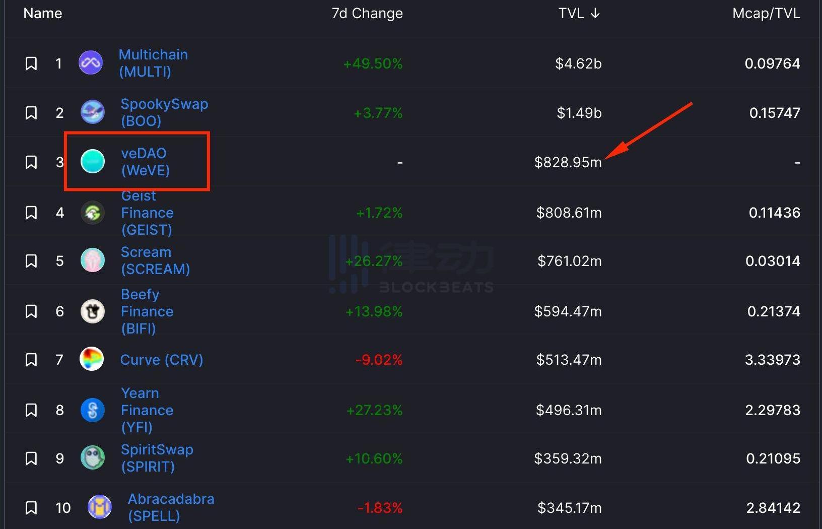 換句話說,veDAO是用WeVEToken來換取用戶的USDC、WFTM、ETH,以此來提高自己的TVL。顯然,這個策略大獲成功:在短短1天的時間里,veDAO的TVL就達到了15億美元,目前排名第2。