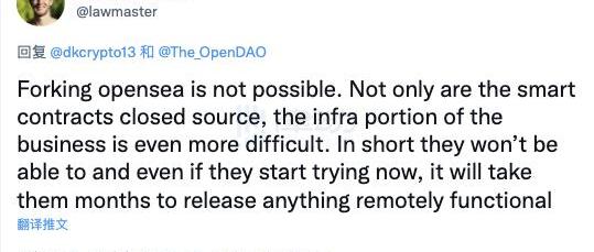 TheBlock研究院副總裁LarryCermak就曾在回復網友關于分叉OpenSea的暢想時提到「分叉OpenSea是不可能的」,OpenSea并不開源,這也就意味著從智能合約的編寫需要從0開始,基礎建設更是一項浩大的工程。