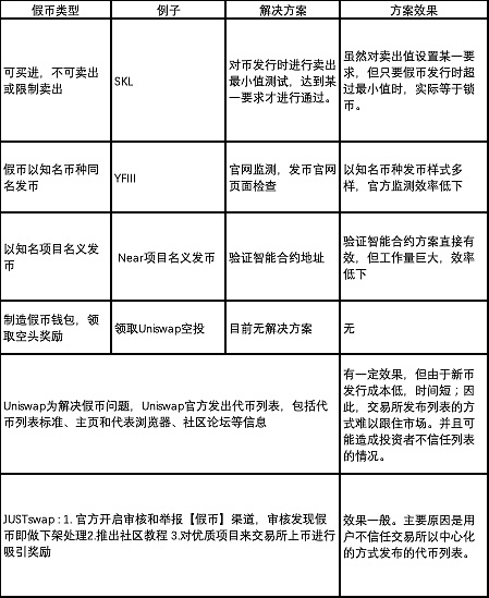 下面為大家統計了去中心化交易所里可能存在的假幣類型以及應對方案: