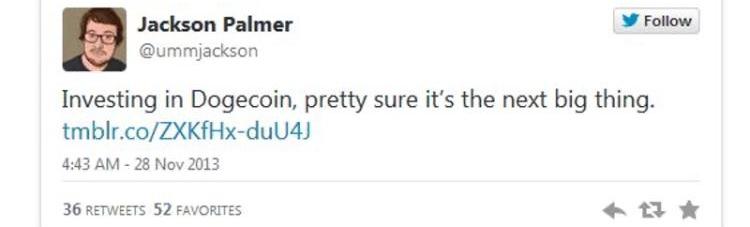 這時,身在Adobe悉尼市場部的營銷專員杰克遜帕爾默萌生了一個惡搞的想法:他決定把以狗頭表情包來做一款數字貨幣,用以諷刺當時數字貨幣圈高漲的投機氛圍。接著,他在Twitter上發了一條推文寫道: