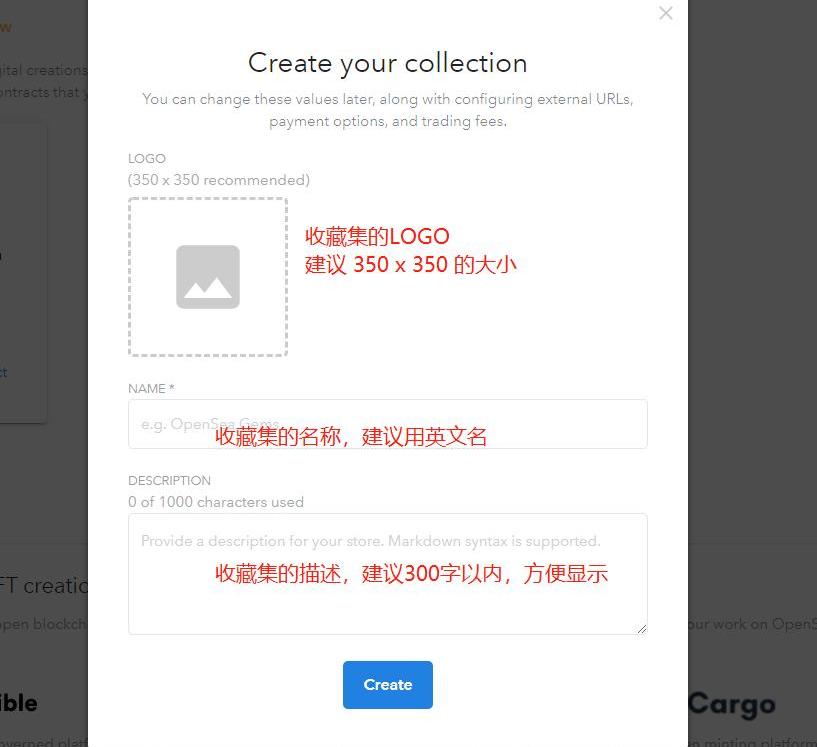 友情提示–重要知識點:希望長期在加密藝術領域耕耘的創作者,通常會為自己的作品創建一個或多個Collections;有了Collections,用戶一旦鐘意您的一個作品,就更方便去搜索或者被推薦同一收藏集的其他作品。為了便于理解,您可以將每個Collection視為現實世界中品牌一樣的存在,每個Collection都對應一個鏈上的獨立合約,同一Collection的每一個NFT都是通過這個合約進行鑄造,如OpenSea這樣的NFT交易平臺也是通過Collection進行分門別類;如果您沒有創建Collection,例如通過Rarible鑄造了單獨的NFT,遵循默認選項RARI,那么您的作品所隸屬的Collection就是RARI的Collection,而作品特征中自行填寫的Artist只是附加信息,無法通用于所有NFT交易市場的分類。