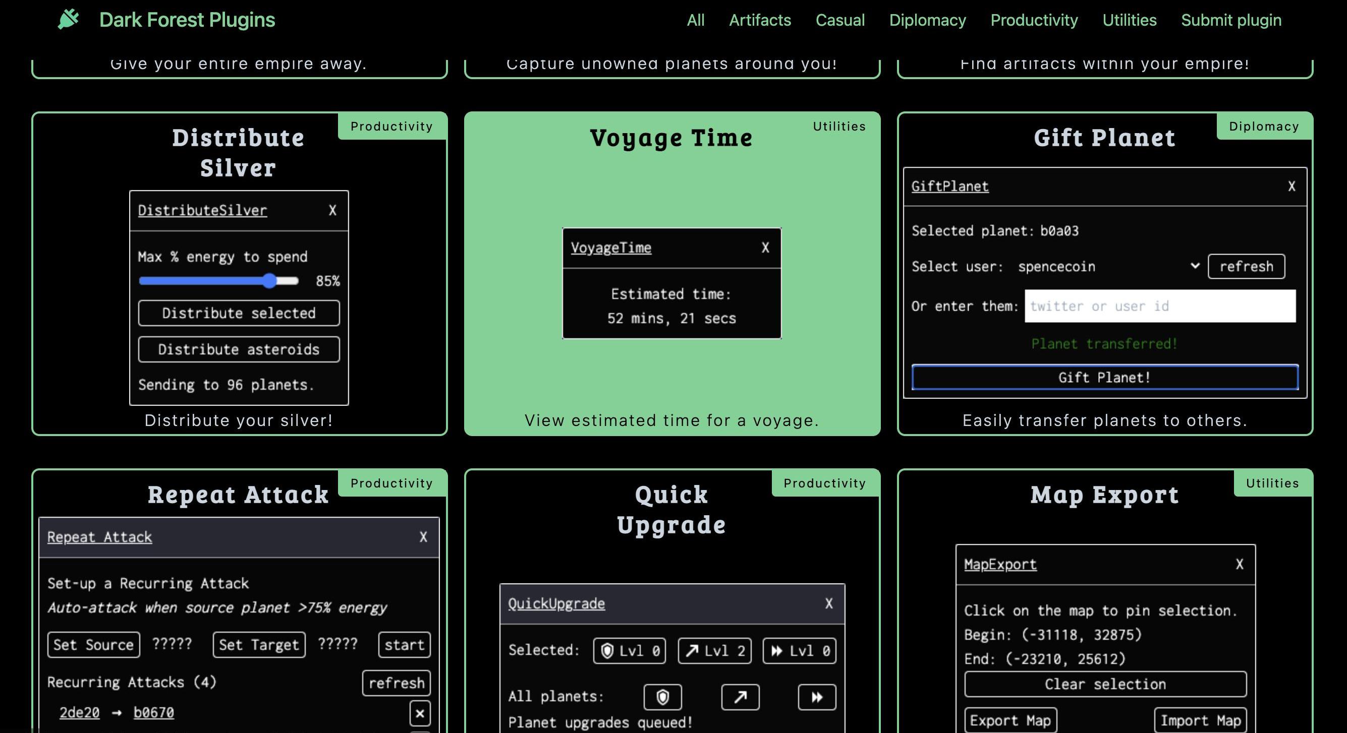 黑暗森林的最初面世版本為2020年8月推出的v0.3,如今已迭代至v0.5版本,此次升級除了優化系統外,還包括一個實驗性的PLUGIN系統并添加了可以通過探索宇宙找到的特殊黑暗森林NFT。每次版本均是以刪檔內測的方式開啟,同時會向排名前15的優勝者送出1024枚DAI作為獎勵。