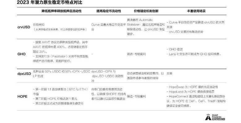 在穩定幣市場中,算法穩定幣曾經被認為是一種非常有前途的敘事。然而,隨著市場的發展,以及UST規模的快速膨脹和覆滅后,人們逐漸認識到這種沒有外部性資產支持的算法穩定幣模式的脆弱性。這讓市場參與者意識到,超額抵押模式是保持穩定幣價格穩定的更為可靠的方式。如今,以超額抵押為核心的原生穩定幣項目依然在探索更加高效的穩定機制、清算機制和更為豐富的抵押資產類型。它們致力于提高資金利用率,以應對市場波動和風險。這些項目的發展不僅為市場提供了更高的資本效率和更多資本套利的機會,而且還為更多的投資者提供了更多的投資選擇,最終也推動了DeFi整體生態的發展。在超額抵押原生穩定幣項目中,有一些是基于已有協議的,如GHO、crvUSD和dpxUSD,它們通過建立在已有流動性基礎上的超額抵押模式,能較大程度保證其價格的穩定性。同時,一些超額抵押穩定幣項目則通過模式創新實現冷啟動,如HOPE,它利用鎖定儲備資產和DeFi生態打造的方式,通過建立儲備池和使用場景,保持穩定幣的價格穩定。當前,歐美銀行頻繁暴雷,中心化穩定幣的穩定性受到質疑,因此鏈上透明的原生穩定幣的地位將更加重要。原生穩定幣的透明度和去中心化特性可以為市場帶來更大的信任和安全感,同時也提供了更多的套利機會和流動性。