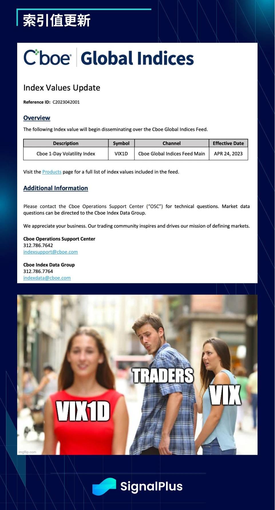 各位朋友,歡迎來到SignalPlus每日晨報。SignalPlus晨報每天為各位更新宏觀市場信息,并分享我們對宏觀趨勢的觀察和看法。歡迎追蹤訂閱,與我們一起關注最新的市場動態。為了應對期權、特別是短期期權交易需求的快速增長,芝加哥期權交易所(CBOE)宣布將推出其旗艦VIX指數的一天版本,名為“VIX1D”,該指數計劃于今天正式投入運作。正如許多市場觀察家所點出的那樣,盡管利率波動創下紀錄,且銀行業出現嚴重動蕩,但傳統的VIX指數在過去9個月中異常平靜,這要不是股票投資者過于自滿,就是該指數已經無法捕捉到完整的風險概況,我們更傾向于后者的觀點。