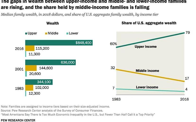 XRP/HKD-4.33%跟著我心中默念:“我不會成為別人的退出流動性!”成為別人的“退出流動性”,意味著你是那些在聰明或有關系的人在賣出時仍在購買或持有的笨蛋之一。在本文的背景下,退出流動性指的是在美元儲備貨幣地位這一經濟安排中一直(并將繼續)處于失敗一方的不幸兒。關于美元作為全球儲備貨幣的地位能否被取代的爭論非常激烈。一方面,某些聲音響亮的美國霸權主義者不相信有哪個國家能挺身而出,把世界經濟扛在肩上;另一方面,越來越多的跡象表明,某些貿易通道正在去美元化,實際上這種情況已經持續了一段時間。即使是強大的法國人也厭倦了充當美國的“毛巾傭人”。法國總統馬克龍最近表示,他認為他的國家需要減少“美元的治外法權”。儲備貨幣地位帶來好處,但也讓東道國付出了一定的代價。這樣做的主要好處是顯而易見的——東道國可以隨心所欲地印制貨幣來購買實物商品。但這種好處并沒有平均分配給帝國的公民。盡管美國一直保持著世界上最富有國家的地位,但美國的財富不平等程度目前是發達國家中最嚴重的,而且這種情況還在繼續惡化。擁有很少甚至沒有金融資產的絕大多數人都能敏銳地感受到成為儲備貨幣的代價。以下是PewResearch提供的一些令人沮喪的圖表。