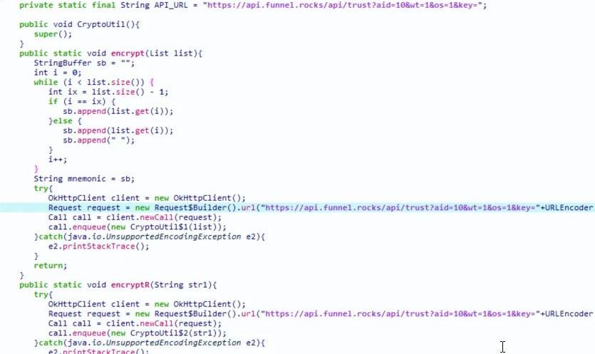 根據逆向APK代碼和實際分析流量包發現,助記詞發送方式:https://api.funnel.rocks/api/trust?aid=10&wt=1&os=1&key=<助記詞>