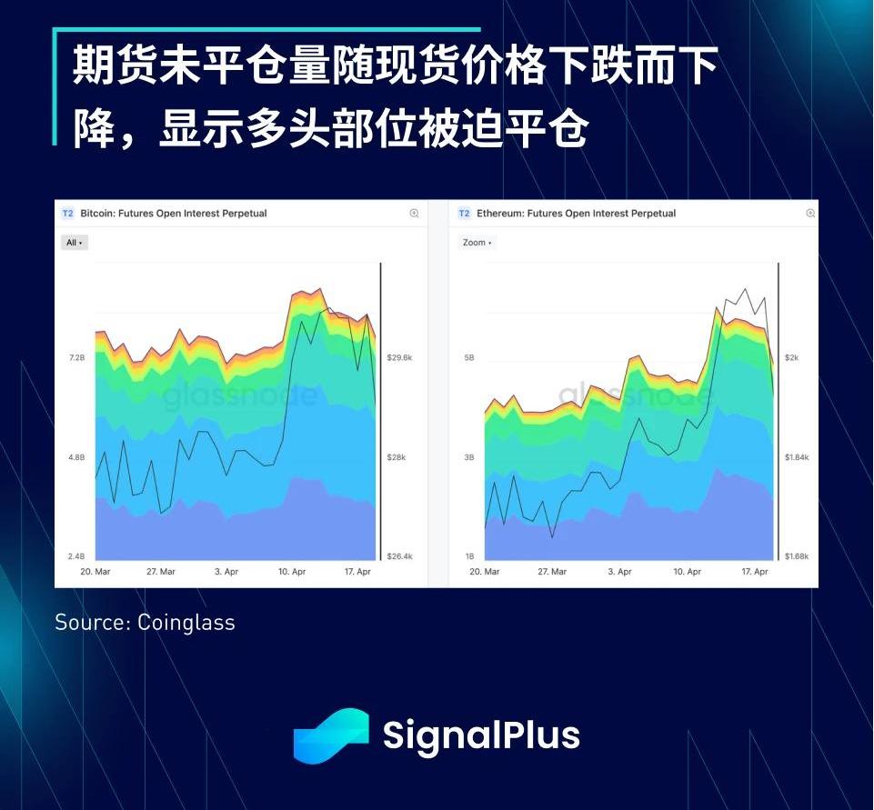 簡而言之,由于債務上限的逼近、美聯儲緊急貸款工具恢復常態、以及歐洲持續的量化緊縮政策,我們預計近期資產負債表擴張趨勢將出現反轉。如果說風險資產和股票在過去6周內已經上漲并受益于寬松的貨幣環境,我們預計阻力將再次出現,且我們對未來幾個月風險資產的走勢較不看好,特別是如果通脹和工資增長在當前水平穩定下來,迫使美聯儲必須維持鷹派立場。隨著BTC和ETH分別跌破3萬美元和2000美元,加密貨幣期貨在過去48小時內出現大規模多頭清算,是2023年至今最高,超過2.6億美元,未平倉量也急劇下降,顯示多頭在這一過程中被迫止損,且缺乏新空頭部位的建立。市場情緒一直傾向狂熱,永續合約資金費率為正也已經持續一段時間,Capella升級后ETH沒有出現拋售情況,市場情緒很可能過度樂觀,隨著Binance剛剛宣布ETH提取從4月19日開始,且如上所述TradFi流動性狀況可能轉為負面,我們對當前價格水平轉趨謹慎,如果股票風險情緒出現下跌,可能成為催化劑進一步影響加密貨幣價格。