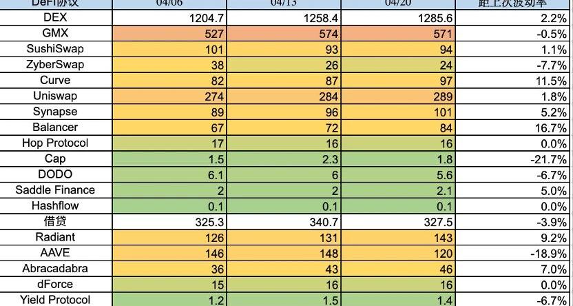 本周TVL出現4.18B的下跌,下降幅度為7.61%,雖然本周meme集體爆發,但市場在回調鞏固。ETH鏈占比同樣下降,從上周的61.3%下降到59.33%,降幅~2%,回到了上個月的水平,但近幾個月的大趨勢看eth生態的TVL在穩定上升。從近七日的數據看,Optimism的TVL在連續幾周后略微反彈,本周漲幅為2.89%,其他Layer2的公鏈都在下跌。Arbitrum下跌0.26%,Polygon下跌1.26%,、Avalanche下跌1.33%。三、各鏈協議鎖倉量情況