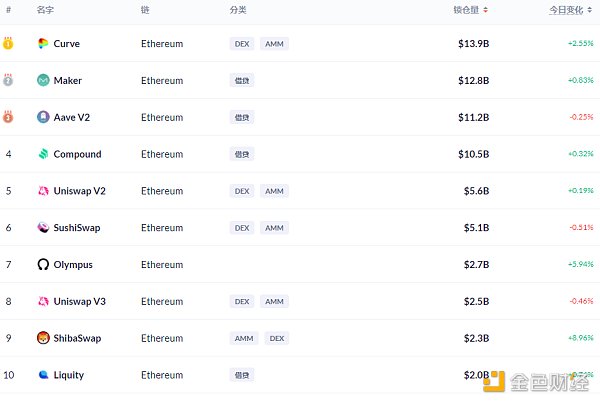 Ethereum鏈上DeFi鎖定資產前十排名及鎖倉量,數據來源:Debank