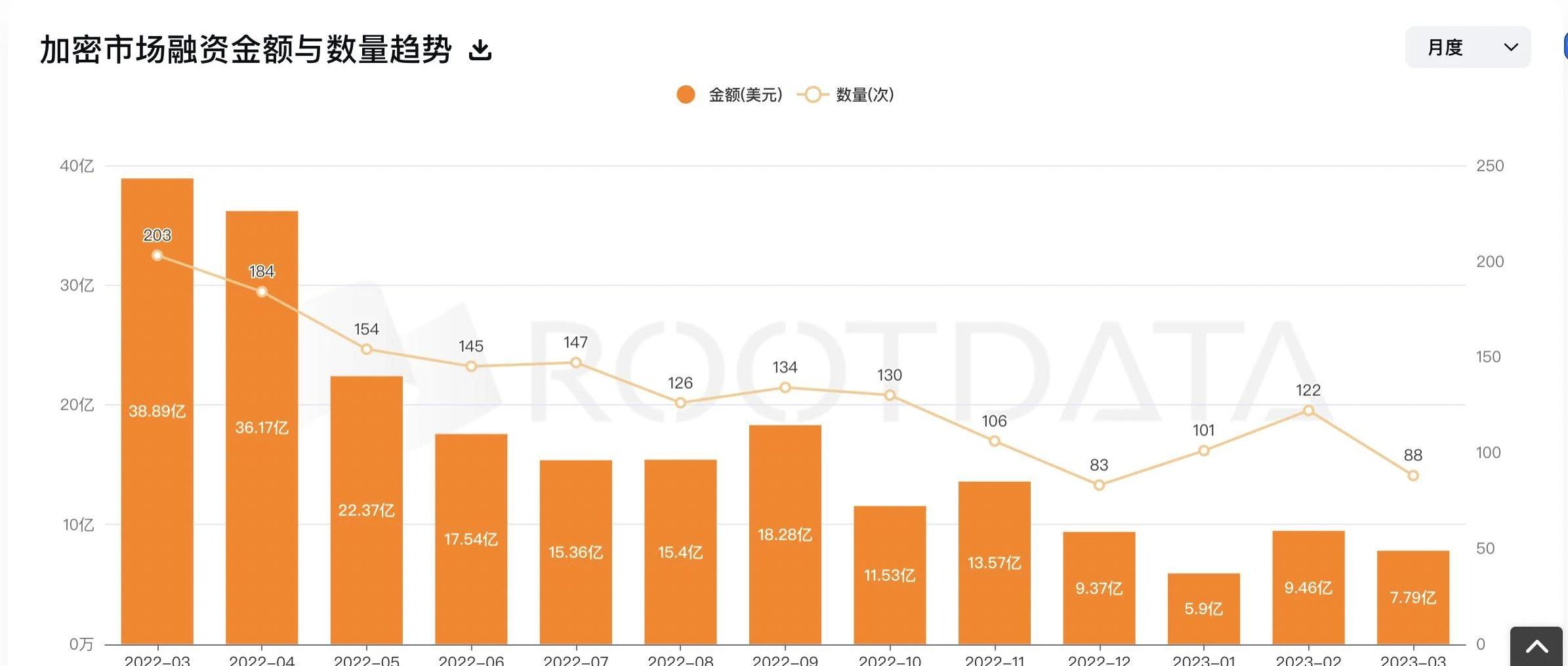 XRP/HKD-0.36%2023年第一季度剛剛過去,身處其中的加密從業者大多喜憂參半。一方面,美國數家銀行發生擠兌危機、監管機構對中心化交易所的持續打壓沖擊著市場信心;但另一方面,以BTC、ETH為代表的加密資產在二級市場表現相當不俗。除價格因素外,我們也相信,加密領域內的多個信號正在顯現出強勁的復蘇和增長跡象。那么,2023年第一季度加密投融資市場具體表現如何?當下市場最熱門的趨勢都有哪些?投資機構們的出手頻次、偏好如何?Rootdata結合平臺統計數據對此進行了全面分析。本報告共包含三個部分:2023Q1加密投融資市場概況、投融資市場趨勢分析以及投資機構表現。一、2023Q1加密市場投融資概況