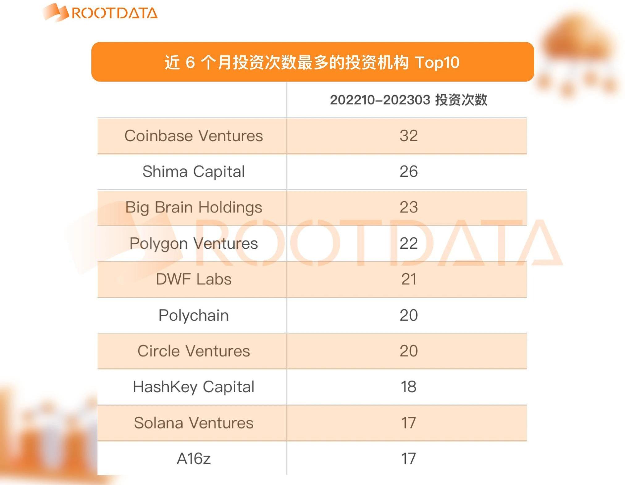 在降幅最大的維度上,MechanismCapital、FoliusVentures、ZeePrimeCapital、PolygonLabs、DapperLabs、TigerGlobal、RepublicCapital等知名機構的跌幅均超85%,公開披露的投資次數都不高于2次。此外,從整體投資次數來看,近6個月排名前十的投資方分別是CoinbaseVentures、ShimaCapital、BigBrainHoldings、PolygonVentures、DWFLabs、Polychain、CircleVentures、HashKeyCapital、SolanaVentures、a16z。
