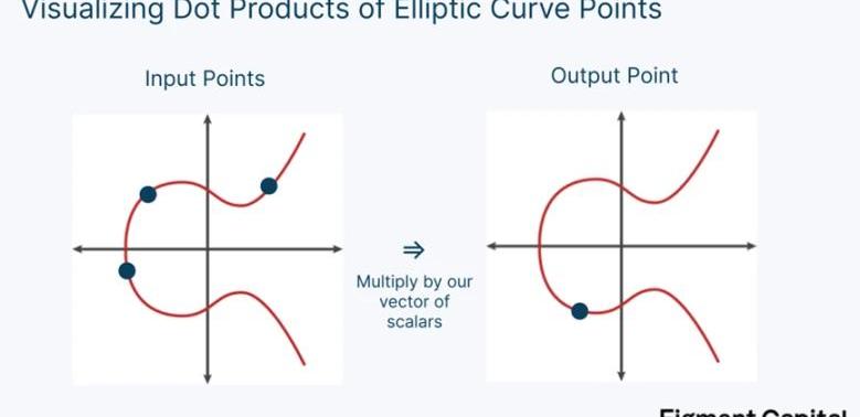 我們在零知識中使用的數學涉及橢圓曲線,它位于素數有限場中。因此,無論我們對橢圓曲線上的任何一點進行何種加法或乘法,其輸出都將是橢圓曲線上的另一個點。標量的點積會輸出另一個標量,坐標的點積會產生另一個坐標,而橢圓曲線點的點積會產生另一個EC點。從視覺上看,橢圓曲線的點積看起來像這樣: