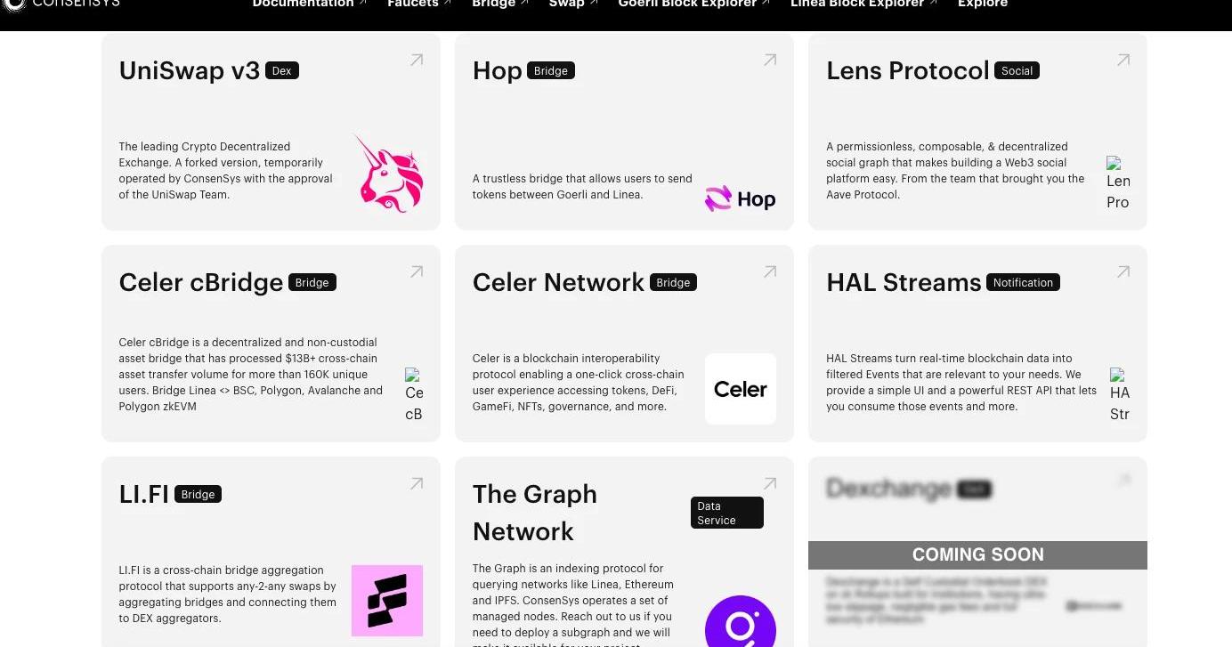 三、都體驗完畢之后,再次回到Linea的網站。我們點擊Explore,可以看到Linea測試網上已經有20多個項目,我們可以持續關注該頁面,選擇能夠交互的項目繼續完成交互測試。
