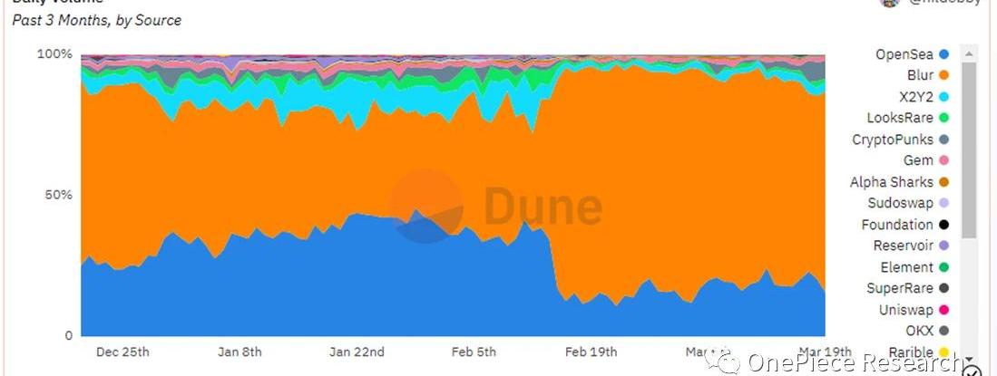 更新迭代的速度跟不上市場需求變化的速度。這意味著Opensea在更新其平臺和功能以滿足市場不斷變化的需求方面進展緩慢。Opensea在早期憑借著較好的流動性深度以及能夠提供品類更齊全的NFT資產領先著市場。但NFT市場非常不穩定,并且容易受到需求突然變化的影響,無法跟上這些變化的平臺可能會失去客戶給競爭對手。本質上,Opensea無法在交易性能上做出超越其他項目的東西,因為市場總會出現Fork的產品。沒有代幣經濟。代幣經濟是指使用代幣作為交換和激勵手段的系統。Opensea目前沒有代幣經濟,這可能會限制其吸引和留住有興趣在平臺上賺取或使用代幣的用戶的能力。LooksRare、X2Y2對其進行的吸血鬼攻擊并且吸引了一批用戶過去就是直接的例證。脆弱的用戶粘性。用戶粘性是指用戶對特定平臺或品牌的忠誠度。Opensea的用戶粘性很脆弱,這意味著用戶不一定忠于平臺,并且可能對投機性投資比對平臺本身更感興趣,換句話說,使用Opensea的大多數用戶對于能夠通過不同平臺進行套利的需求大于對平臺本身性能的追求。Blur正是瞄準這一部分用戶的需求,進行了具有強預期管理的代幣空投計劃。總體而言,這些因素表明Opensea可能難以在快速發展的市場中競爭,并且給予后發項目以啟示。為了保持競爭力,Opensea可能需要專注于改善其平臺功能和用戶體驗,創建代幣經濟以激勵用戶參與,并建立更牢固的客戶關系以提高用戶粘性。