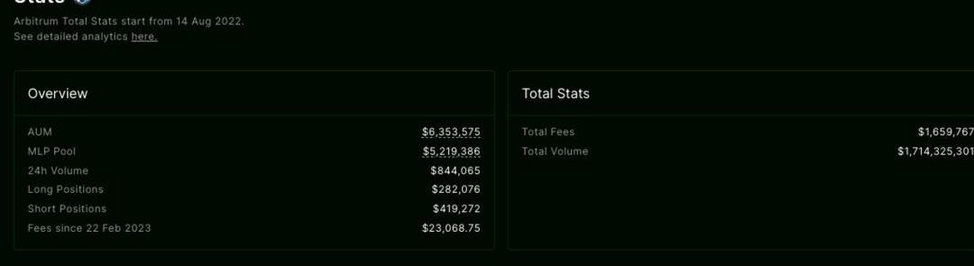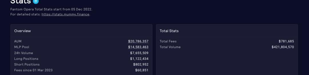 MummyFinance是由Fantom基金會支持的GMXfork。機制上,MummyFinance在冷啟動代幣的分發上新增了使用NFT發放esMMY并給予了NFT持有人80%的國庫FTM分紅。在費用分配上將MLP的比例由70%下調至60%,其中5%分配給開發團隊,5%用于回購并添加Equalizer的MMY-FTMLP。此外,除了MLP中有FTM作為一攬子資產外,其余機制與GMX相同。截至目前,Mummyfinance的平臺交易量已超過4億美金,MLP已有近1500萬美金的TVL,產生了約78萬美金的費用,數據并不亮眼。