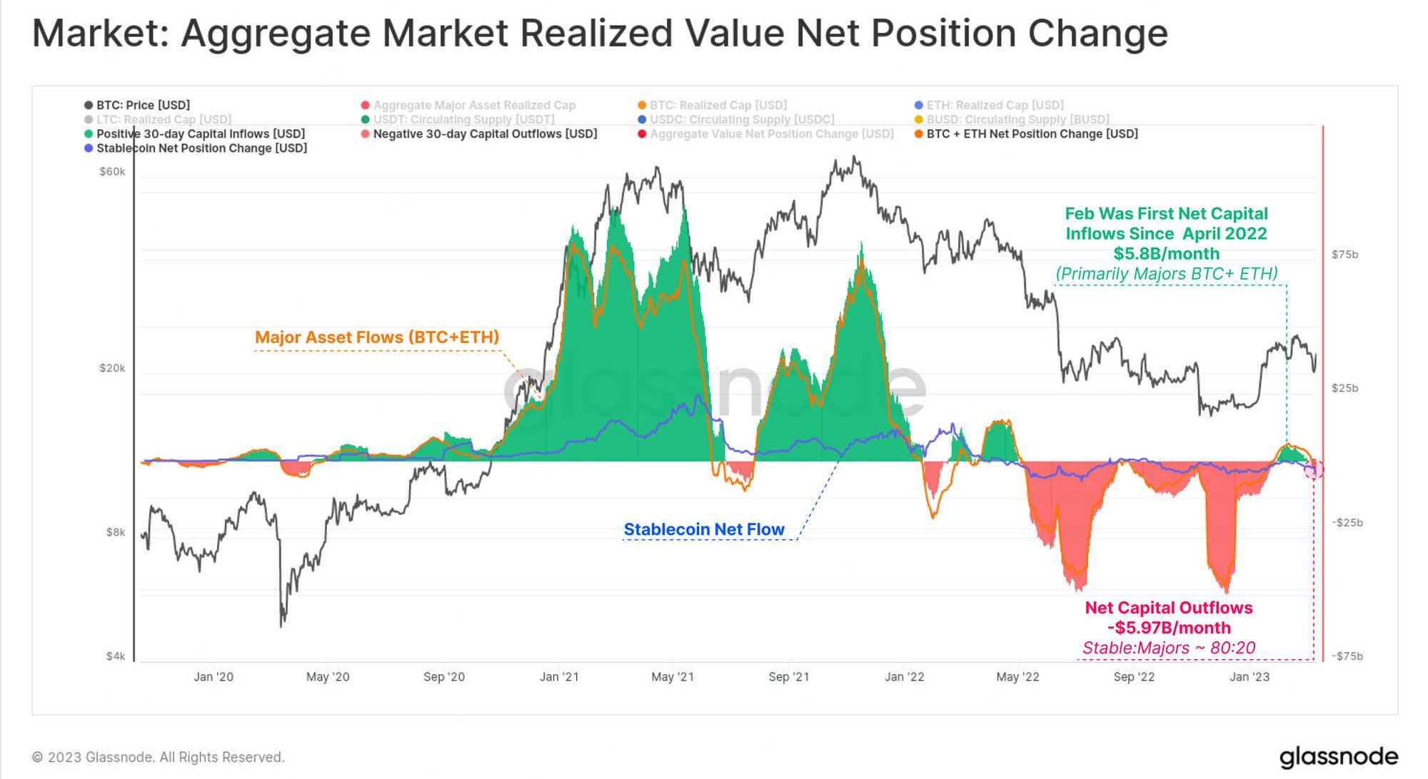 實時高級圖表按30天變化計算,2月是自2022年4月以來首次出現資金凈流入,峰值為+58億美元/月,主要由BTC和ETH引領。然而,上個月,市場出現了-59.7億美元的逆轉流出,其中80%是穩定幣贖回的結果,20%來自BTC和ETH的已實現損失。