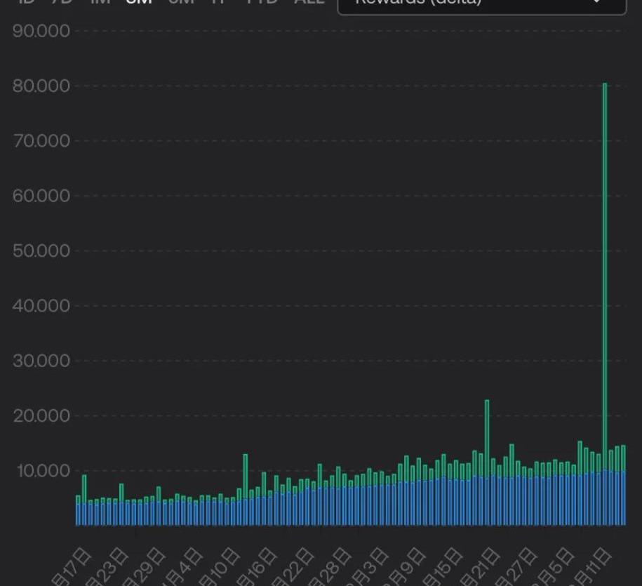 來源:TrendResearch,Tradingview此外,Frax系統帶有ETH2.0流動性質押服務,在市場動蕩之際,由于搶跑交易的增多,3月10日前后的節點收入大增了五倍以上。圖:frxETH節點收入。藍色是基礎獎勵,綠色是手續費‘打賞’收入
