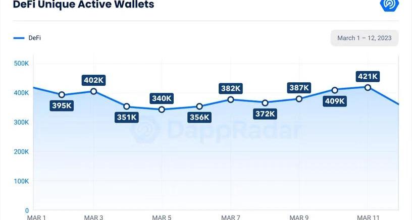 DeFi是最容易受到市場崩潰和不確定性時期影響的Dapp類別。當FTX和Luna崩潰時,DeFi明顯受影響。3月11日,在SVB崩潰和USDC脫鉤之后,DeFi市場的TVL大幅下降,從792.8億美元下降到716.1億美元,下降了9.6%。這一消息在投資者中引起恐慌,導致大量拋售和TVL下跌。幸運的是,13日硅谷銀行的USDC儲備金完全向公眾開放,這一消息導致DeFiTVL銷售額飆升13%,達到811.5億美元。此外,在3月8日至3月11日期間,與DeFi合約交互的獨立活躍錢包數量增長了13%,從421,026個增加到477,094個。