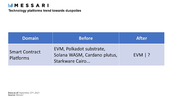 很明顯,我們現在處于下圖中的智能合約平臺“Before”階段,有大量的潛在解決方案 (包括 EVM、Polkadot substrate、Solana WASM 等等,如下圖所示)。但還要多久才會出現兼并呢?如果確實會發生兼并,我們真的能想象出一個 EVM 沒能成為“雙頭壟斷”中的“一頭”的未來嗎?