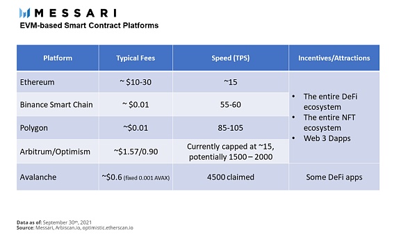 上圖:各大 EVM 智能合約平臺的費用、TPS、激勵/吸引力的對比。