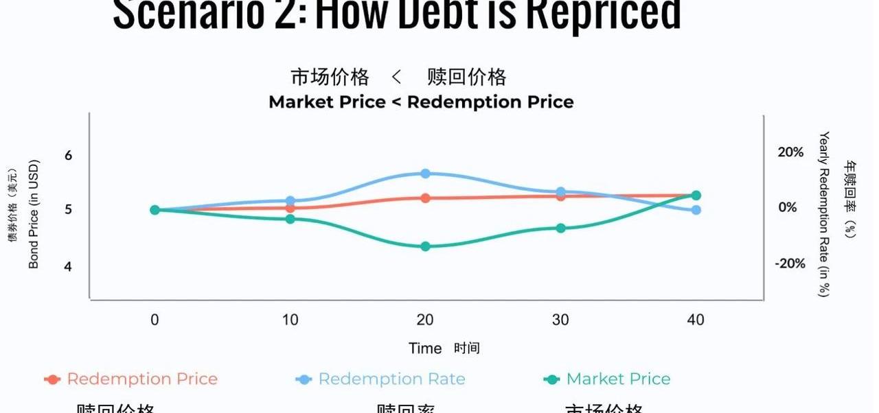 圖片來源:RAI中文白皮書0為初始狀態;10分,RAI的市場價格提高,市場價格高于贖回價格,此時已經有套利者開始鑄造新的RAI出售給市場套利,系統的贖回率為負;20分,系統進一步降低RAI的贖回價格,套利空間增大,鑄造率進一步提高;40分,系統重新到達穩定狀態。當市場對RAI的需求萎靡,導致RAI的市場價格下跌時,系統的調整也是相對的。系統會自動提高贖回價格,使得RAI的贖回價格更加顯著的高于市場價格,從而使得系統內的借款人更加傾向于償還借款,即從市場購買RAI償還給系統,從而使得RAI供應量降低,市場價格提高。整個過程如下圖所示: