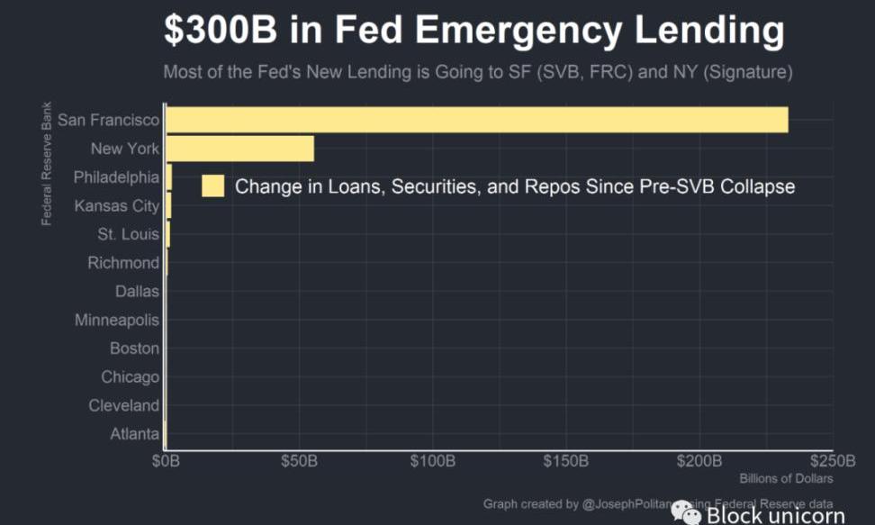 美聯儲有意不立即公布他們貸款給了哪些機構以及他們借了多少,但通過查看地區聯邦儲備銀行的總資產數據,我們可以大致了解誰從美聯儲獲得了流動性。查看包括貼現窗口貸款和BTFP資金在內的項目,我們可以看到貸款并不是均勻分布在全國范圍內,而是嚴重集中在兩家聯邦儲備銀行。對SVB和第一共和國銀行擁有管轄權的舊金山聯邦儲備銀行的資產增加了2330億美元,對Signature擁有管轄權的紐約聯邦儲備銀行的資產增加了約550億美元。這并不一定意味著所有的貸款都集中在SVB、SignatureBank和第一共和國銀行3家銀行——幾家西海岸地區銀行也出現了困境,紐約聯邦儲備銀行對許多不一定只在紐約的金融機構(例如,大多數外國銀行組織)有管轄權——但這確實意味著危機并不一定導致全國各地的銀行向美聯儲借款。