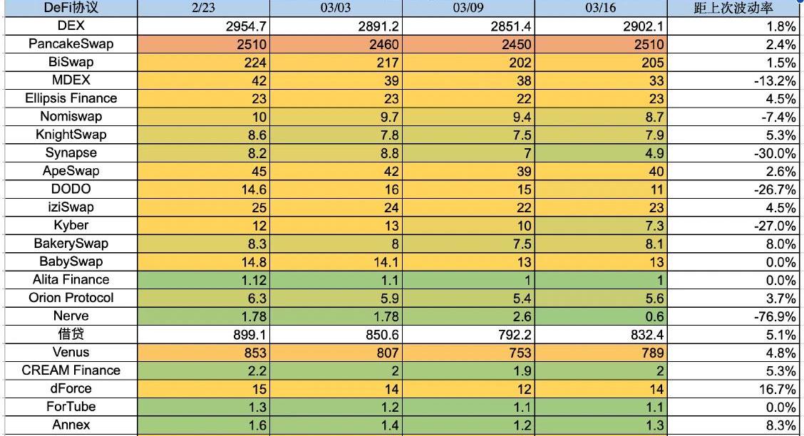 本周TVL略微回升,上漲~2b。但是Ethereum及layer2的主流公鏈仍在下跌,從近七日的數據看,在Layer2公鏈中,Polygon下跌4.04%,Arbitrum下跌5.12%、Optimism下跌1.14%、Avalanche跌幅達14.79%。其中,看近1天的情況,收到空投消息的影響,Arbitrum有5.96%的回升。3.各鏈協議鎖倉量情況