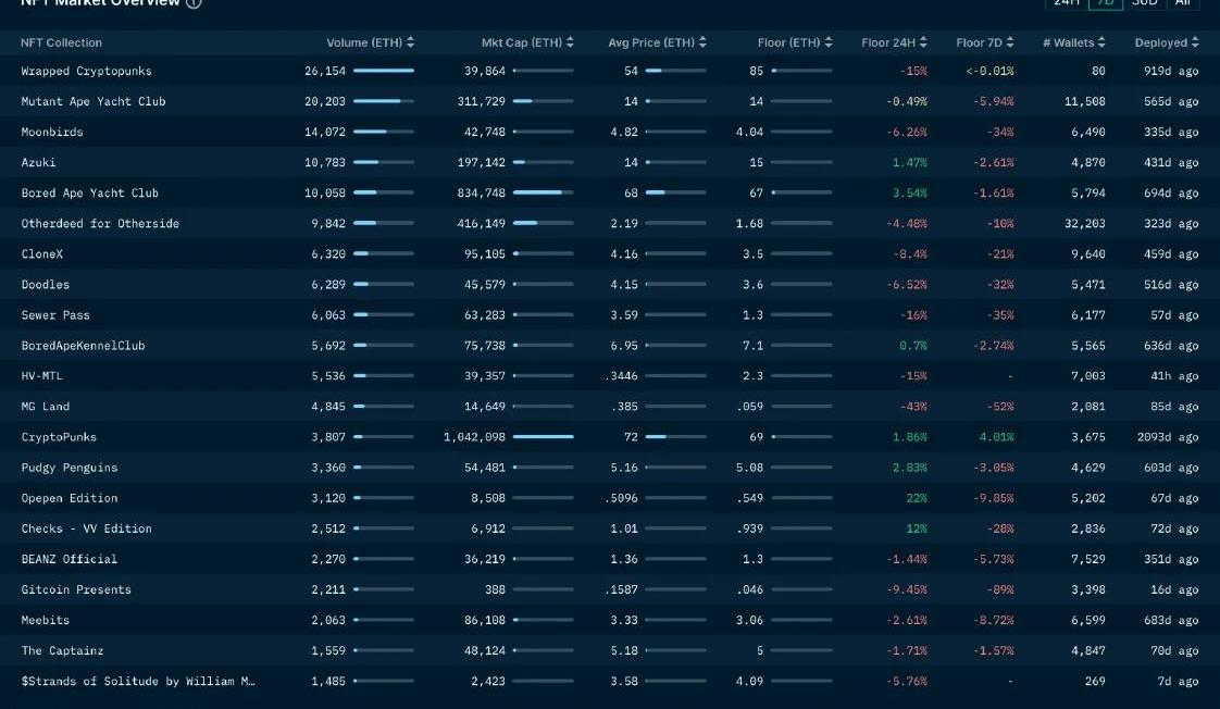 當前鏈上轉賬費用約為0.6美元,Uniswap交易費用約為5.54美元,Opensea的交易費用約為2.15美元。近幾周gasfee持續保持在底部區間,市場活性的調動仍然缺乏熱點。從gas消耗看,Uniswap和Blur占據頭部位置。5.NFT市場數據變化