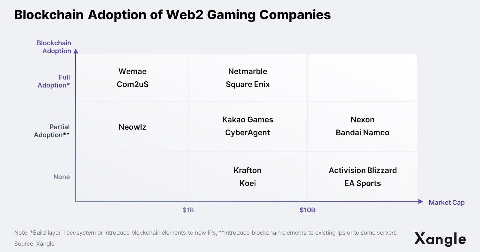 SquareEnix是一家領先的日本游戲公司,其核心IP最突出的包括《FinalFantasy》和《DragonQuest》。與過去該公司利用其核心IP生產主機游戲系列不同,它已成功轉型至移動端,其移動游戲收入現已占游戲總收入的一半即是證明。在成功轉向移動端之后,SquareEnix最近提出將區塊鏈游戲作為中長期增長戰略。在2023年的新年致辭中,SquareEnix首席執行官松田洋介強調了區塊鏈游戲的增長潛力——脫離了游戲公司單方面提供游戲的動力,并促進了游戲內用戶驅動的增長。目前正在開發中的《Symbiogenesis》體現了這一愿景,其有望成為SquareEnix推出的首款全新區塊鏈游戲。目前透露細節仍然很少,只知道Symbiogenesis將在Polygon區塊鏈上啟動,以及其將是一款基于10,000個NFT并擁有自己宇宙的NFT游戲。盡管區塊鏈在其旗艦IP“最終幻想”和“勇者斗惡龍”中的部署尚未敲定,但新年消息似乎預示著可能會從《Symbiogenesis》開始開發和發行更多區塊鏈游戲。在全球100強游戲公司中,約70%位于亞洲。我們調查了這些公司,以分析他們的區塊鏈采用計劃。結果表明,韓國游戲公司處于開發區塊鏈游戲的最前沿。